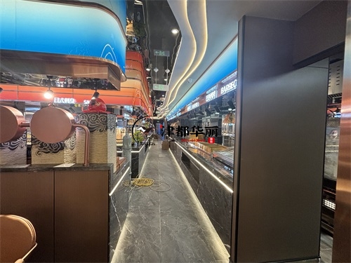 今天分享的是銀川回香漁自助餐廳裝修設計實景,這家自助餐廳裝修設計將“潮流科技感”與“輕奢休閑風”兩種風格巧妙融合在一起,既貼合當下年輕消費群體的審美偏好,又通過空間層次的營造兼顧了自助餐飲的功能需求,是近年餐飲空間設計的典型流行范式。前廳的頂面與墻面采用波浪形的曲面造型,搭配橙紅、寶藍等高飽和度漸變色彩,疊加內嵌式線性燈帶的勾勒,既打破了傳統餐廳的規整感,又通過科技感的光影營造出“賽博休閑”的氛圍——這種手法既借鑒了網紅餐飲的“打卡屬性”設計,又通過色彩分區(如橙紅對應熱菜區、寶藍對應海鮮區)實現了功能引導,讓顧客能快速識別餐區類型。